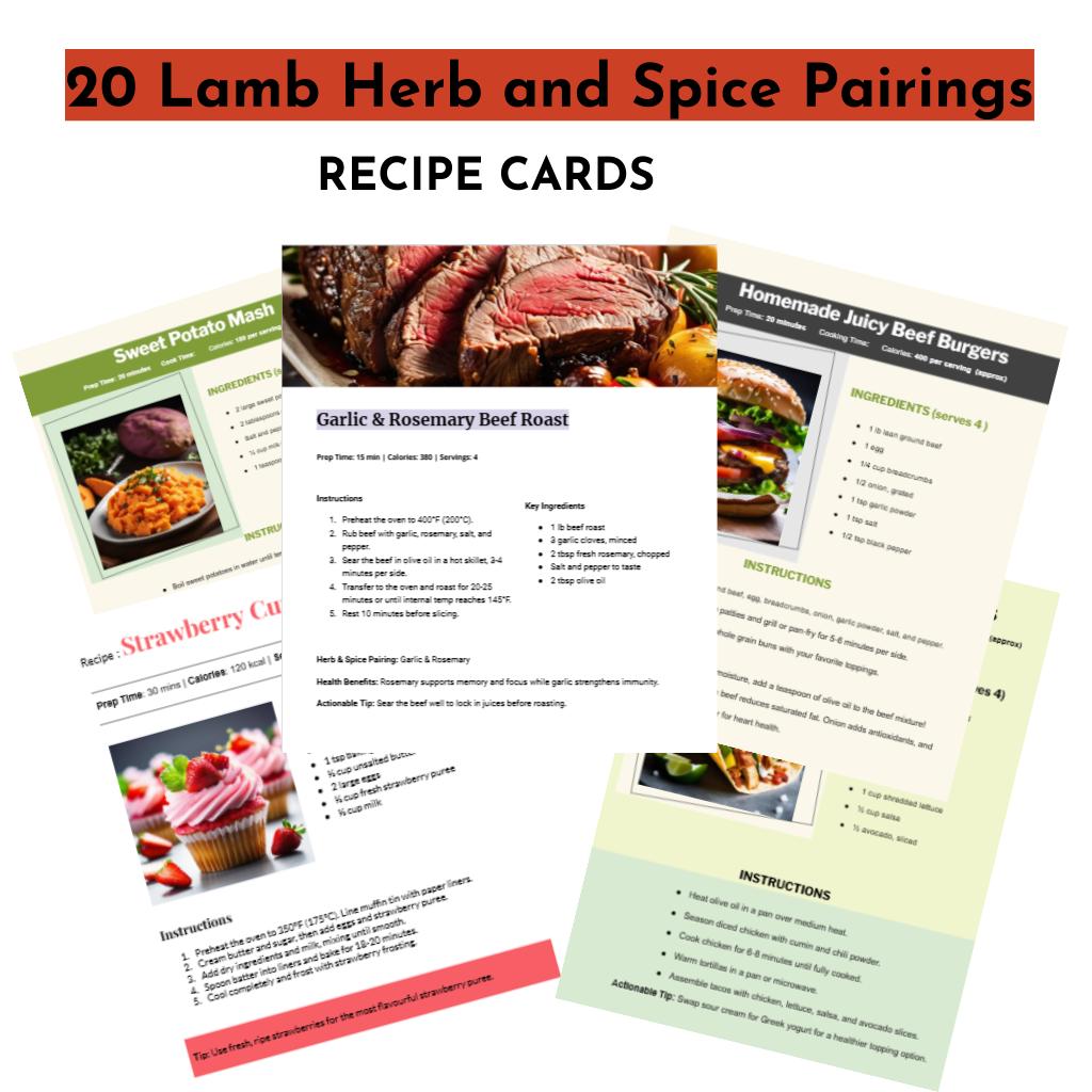 20 recipe cards featuring herb and spice pairings for lamb. A simple guide for perfectly seasoned and delicious meals.